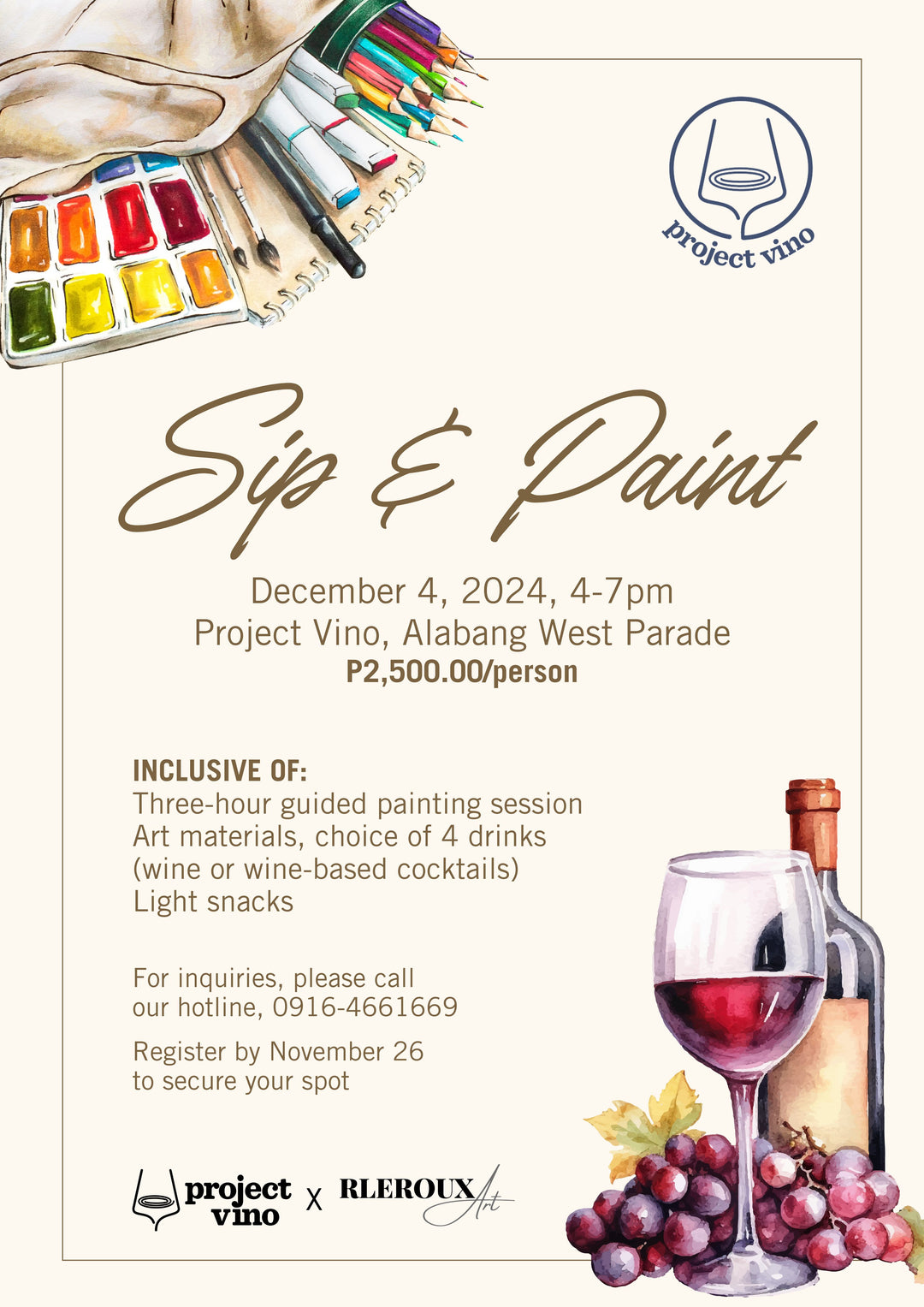 Come spend an afternoon of painting and fine wines at Project Vino Alabang. Open to painters of all skill levels, from beginners to intermediates. This event, led by Rachel Leroux, will surely be an exciting day full of creativity, beautiful colors, and great company!